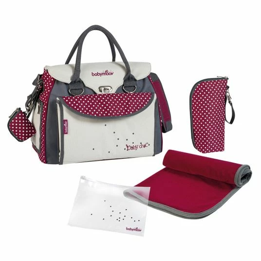 The Changing bag Baby Chic by Babymoov not only looks great, it is also the ideal companion for on the go. Also included are a removable diaper changing pad, an insulated pocket, a transparent pocket for diapers or dirty clothes, a pacifier with carabiner attachment, and a fleece blanket. Particularly practical: Pictograms on each accessory indicate its purpose.