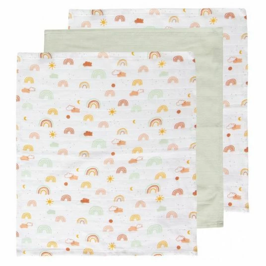 Das Musselin Pflegetuch 32 x 32 cm im 3er Pack – Rainbow Sky von bébé-jou ist besonders soft und saugfähig. Die vielseitigen Mulltücher kannst Du unter anderem als Waschlappen, Spucktuch, Lätzchen und Schmusetuch verwenden. Das Material aus Bambus und Baumwolle ist super weich, hautfreundlich und angenehm sanft zur zarten Haut Deines Babys. Die hübschen Allover-Muster machen sie zum Hingucker für Groß und Klein.