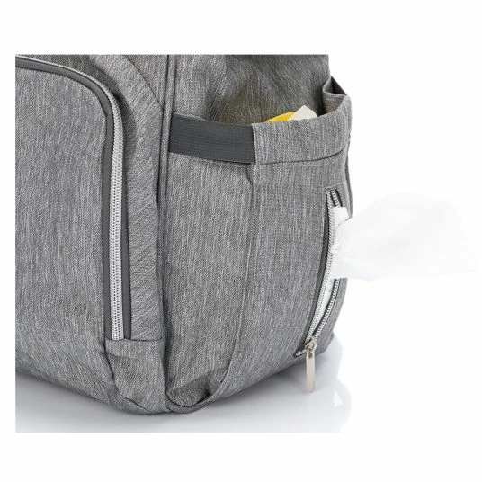 Der Wickelrucksack hat ein geräumiges Hauptfach und durchdachte Staufächer außen, für die Dinge, die Du schnell zur Hand haben möchtest. Hinten befindet sich unter anderem ein wasserabweisendes Feuchtfach, vorne eine Gläschenhalterung, ein integriertes Handyfach und eine Befestigung für Deinen Schlüssel, damit Du diesen nicht lange suchen musst. Zum weiteren Zubehör zählen außerdem eine wasserabweisende Wickelunterlage und eine praktische Kinderwagenbefestigung. Die Kinderwagenbefestigung wird mit Klettverschlüssen an Deinem Schieber befestigt und die Tasche ganz einfach an den Karabinern eingehängt.