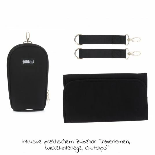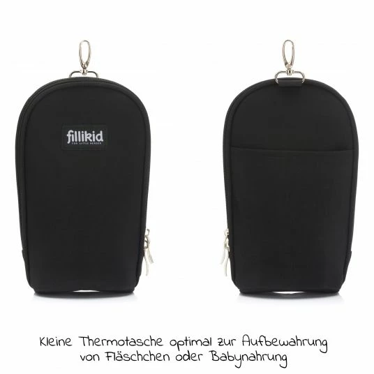 Die mitgelieferte Thermotasche in gleichem Farbton hält jedes Getränk über längere Zeit hinweg warm oder kalt und lässt sich auch innen oder außen befestigen. Dazu erhältst Du eine Fillikid Wickelunterlage, die sich einfach zusammenfalten lässt und Deinem Baby eine komfortable Liegefläche bietet. Der robuste Nylonstoff ist sehr pflegeleicht und kann mit einem feuchten Tuch abgewischt werden, sollte sie doch auf dem Spielplatz einmal recht schmutzig werden. Dank der praktischen Befestigung mit Karabinerhaken lässt sich die Wickeltasche jederzeit an den Kinderwagen anbringen.
