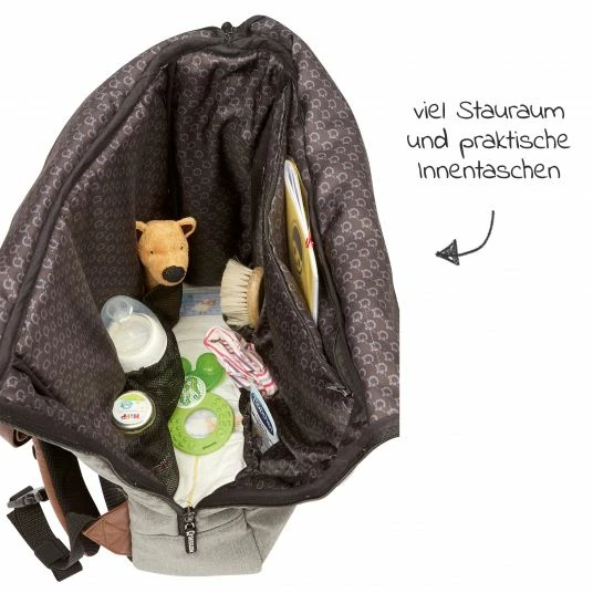 Im Inneren des Wickelruksacks befinden sich praktische Einsteckfächer und ein Reißverschlussfach, die für Ordnung und eine gute Übersicht sorgen. Hier können Windeln, Pflegeprodukte, Wechselkleidung und Snacks problemlos verstaut werden. Außen befinden sich ein zusätzliches Einsteckfach für das Fläschchen und ein Reißverschlussfach für Wertgegenstände. So hat alles seinen Platz und ist schnell zur Hand.