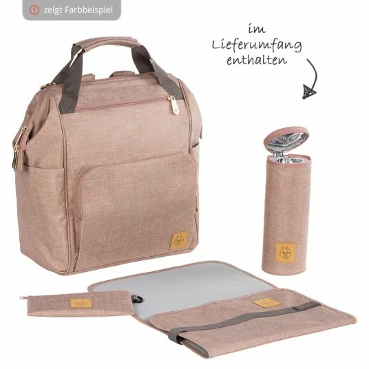The Glam Gold Backpack has a spacious main compartment and well thought-out storage compartments on the outside for the things you want to have at hand quickly. Inside, you’ll find a water-repellent wet pocket, a removable glass holder, an integrated mobile phone pocket, a pen holder and a key holder so you don’t have to search for it. Other accessories also include a water-repellent changing mat, an insulated bottle container, a practical pram attachment and an adjustable shoulder strap to carry the backpack like a shoulder bag. The stroller attachment is attached to your slide with Velcro fasteners and the bag is simply attached to the carabiners.