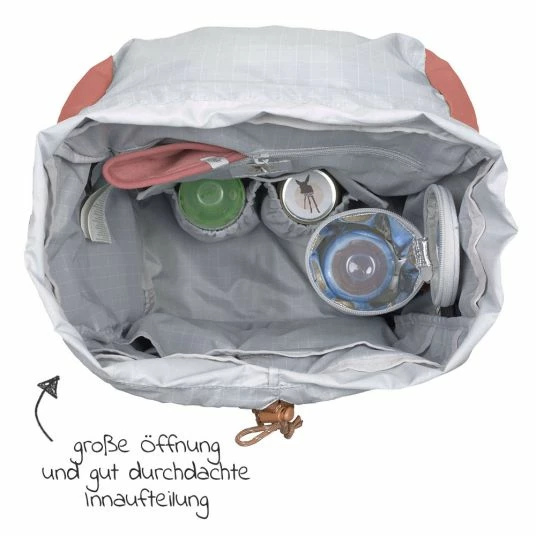Geht es auf einen Ausflug mit Deinem Nachwuchs, ist der Rucksack gut gefüllt und mit durchdachten Utensilien gepackt: Von Getränken, kleinen Snacks, Wechselwäsche, Windeln, Sonnencreme und vielem mehr muss alles im Rucksack Platz finden. Der Lässig Wickelrucksack Green Label Outdoor Backpack in Cinnamon bietet dafür viel Stauraum, dank zahlreicher Staufächer innen und außen.