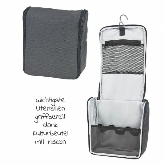 Damit Du wichtiges ZubehΓΆr zum schnellen Wickeln in greifbarer NΓ€he vor Dir hast, kannst Du alles in der Kulturtasche verstauen. Dank integriertem Metallhaken im Deckel lΓ€sst sich die Kulturtasche aufhΓ€ngen und gibt Dir die komplette Γbersicht ΓΌber alles Eingepackte frei. Netztaschen verhindern ein Herausfallen des ZubehΓΆrs.