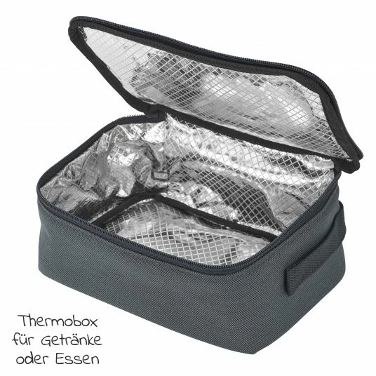 FΓΌr Mahlzeiten oder GetrΓ€nke die kΓΌhl oder warm gehalten werden mΓΌssen, gibt es eine isolierte Thermobox, die Du einzeln entnehmen kannst. Mit der hygienischen und pflegeleichten Wickelunterlage kannst Du Deinem Baby ΓΌberall unterwegs bequem die Windel wechseln.