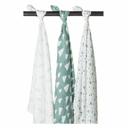 3 Meyco Mull-Pflegetücher 120 x 120 cm – Federn Wolken Dots in Grün