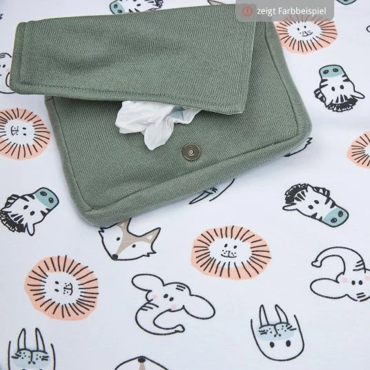 Durch den Reißverschluss kannst Du alle handelsüblichen Feuchttuch-Packungen in der Tasche austauschen. Damit die Tücher nicht austrocknen und die Tasche trocken bleibt, befindet sich im Inneren und an der Öffnungsklappe eine abwischbare PU-Schicht. Im praktischen Format von 20 x 12,5 x 4,5 cm lässt sich das Täschchen wunderbar auch für unterwegs in der Wickel- oder Handtasche unterbringen.