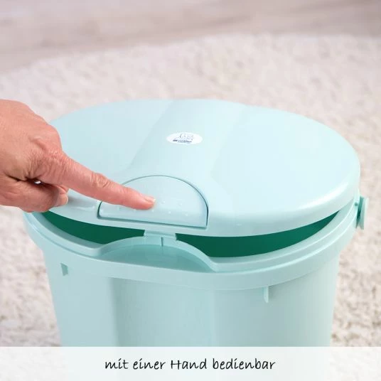 When changing diapers you should always secure your baby with one hand and therefore have only one hand free for the full diaper. With the Windleimer Top designed Swedish Green by Rotho Babydesign this is no problem. The lid opens almost automatically by tapping on it. With a capacity of 11 litres, there is space for many used diapers inside. The curved and generously dimensioned carrying handle makes it easy to lift and empty.