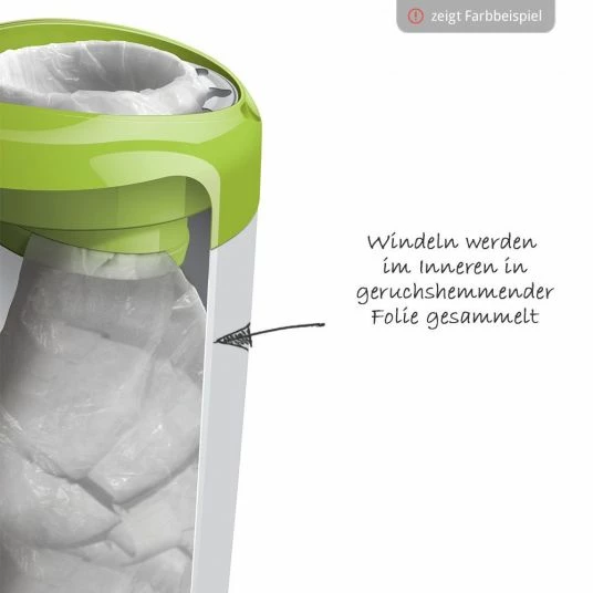 With this diaper bucket the diapers are not packed individually, but collected in a foil tube. This means less film is needed and the environment and your wallet are protected. A foil cassette is already included in the scope of delivery. The odour inhibiting film was treated with Biomaster silver biocides tested according to ISO 22196-2011.